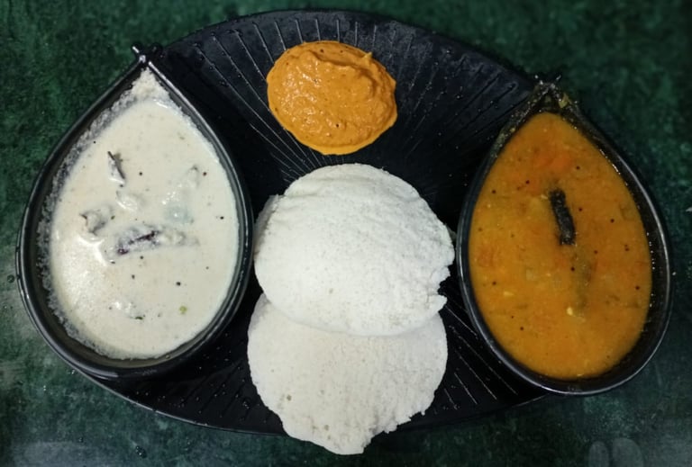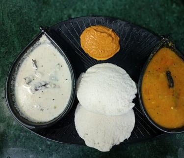 Soft, fluffy idlis paired with a hearty, spiced sambar — a comforting duo that warms the soul. Steamed to perfection, this breakfast staple is light, nourishing, and full of tradition.